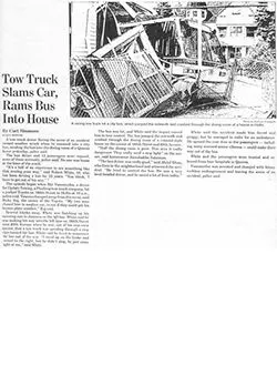 Auto Accident—Tow Truck Slams Car, Rams Bus Into House